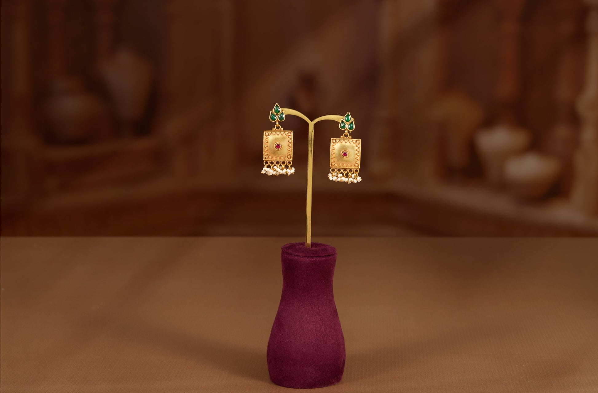 A truly unique piece that re-envisions the traditional haaram style. The necklace features a long, elegant beaded chain with the distinctive rectangular medallion pendant—detailed with tiny ruby-like and emerald-like semi-precious stone accents. The pendant is finished with a charming cluster of pearl drops. The Earring follows same pattern of a tiny rectangular medallion with pearl drops.
