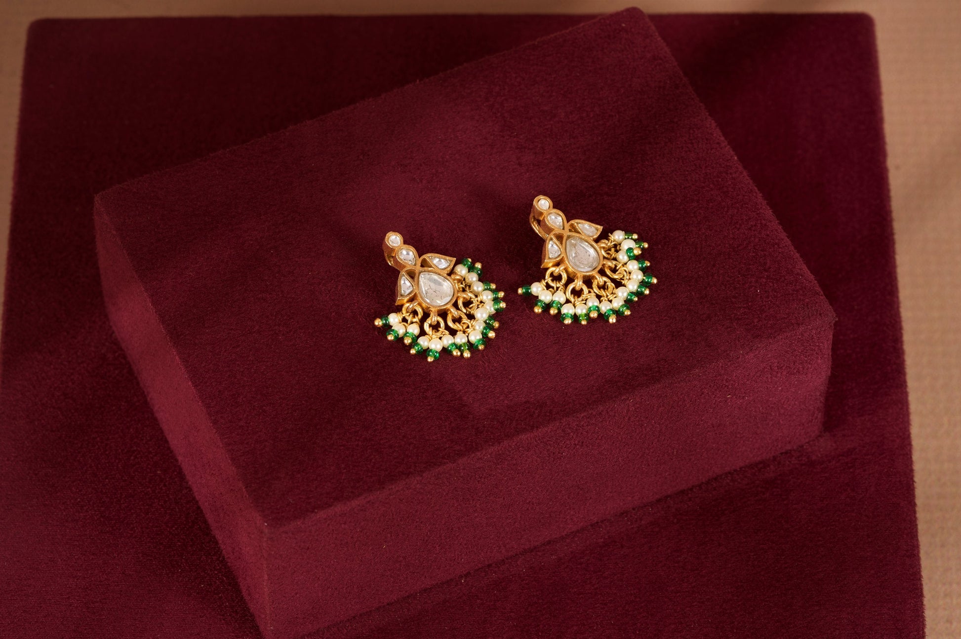 This elegant pair of Bugadi features the teardrop motif with the green bead fringe. The prominent stone is an uncut or diamond-like crystal, which provides a unique, rustic luster. The fringe adds wonderful texture, movement, and a rich color contrast.