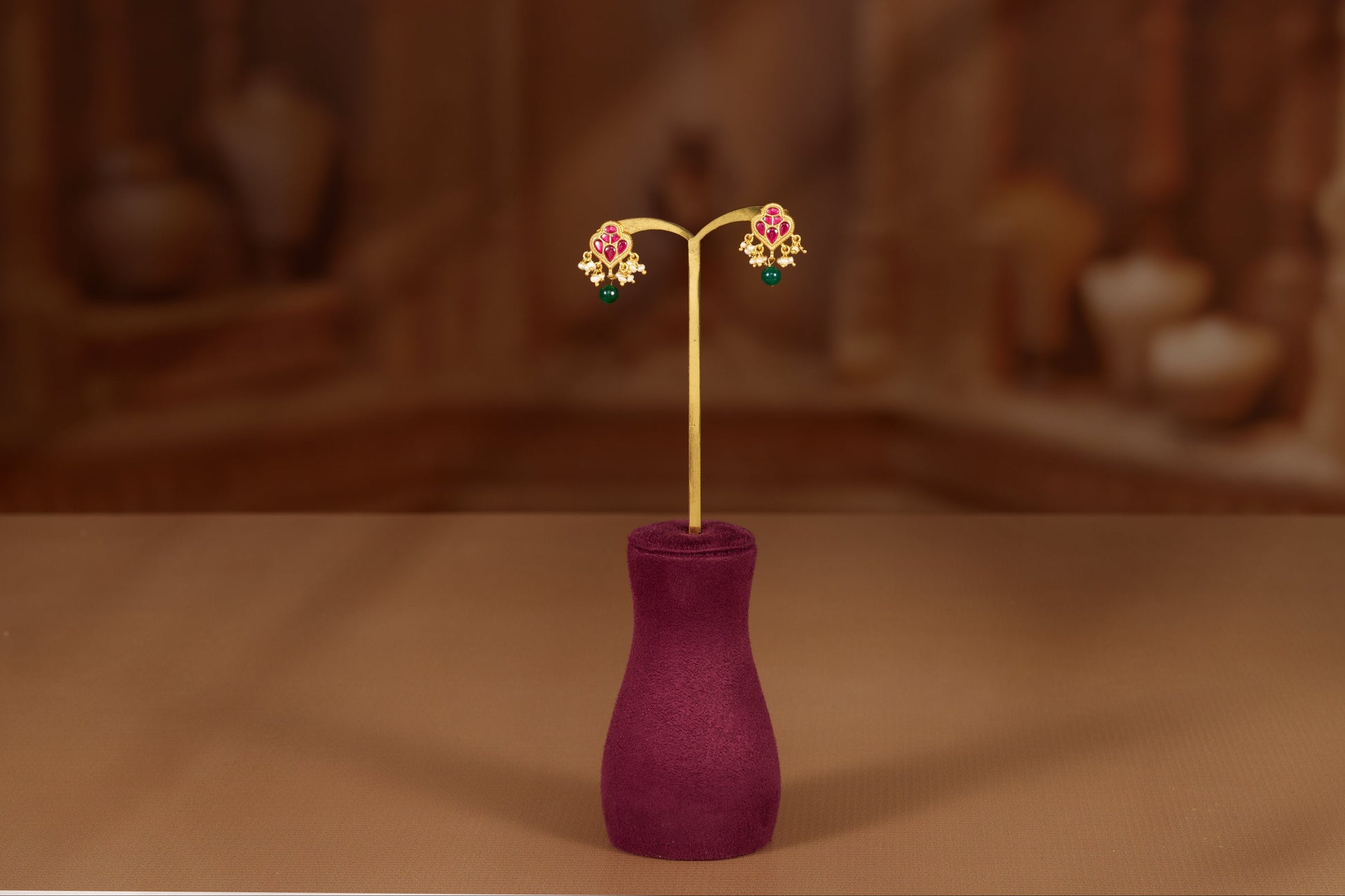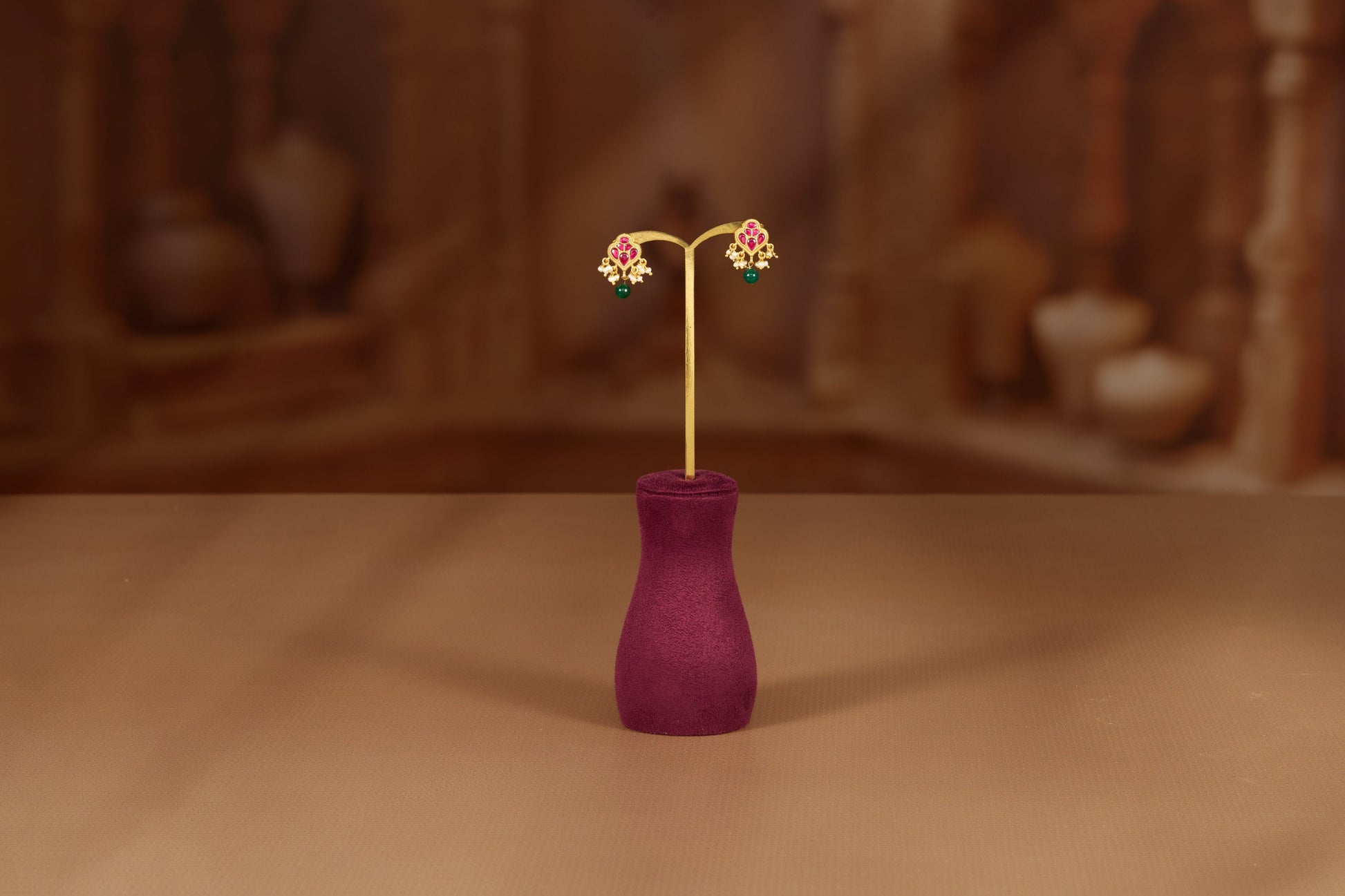 The main motif is a delicate floral cluster. The central part is embellished with small, bright ruby-like stones, typically synthetic, providing a striking deep pink hue. A single emerald-like drop dangles gracefully from the bottom, offering a beautiful contrast of deep green against the red and gold, completing the traditional color palette of classic Indian jewelry.