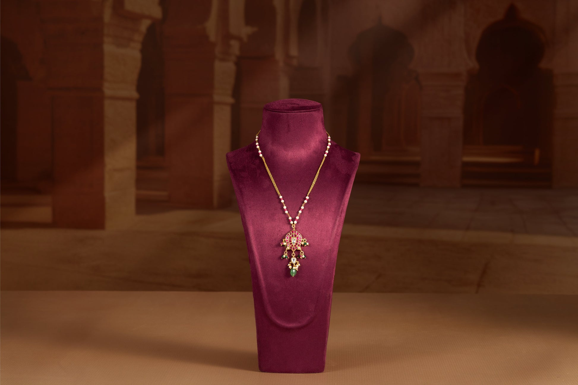 The necklace features a very fine, light gold chain interspersed with small, lustrous white pearls that add classical texture. The pendant itself is a multi-gemstone masterpiece. The decorative central motif featuring a rich, pink/ruby-toned stone. Below this, a fringe of small pearls, emerald green beads, and possibly pink briolettes dangles, adding color and movement.