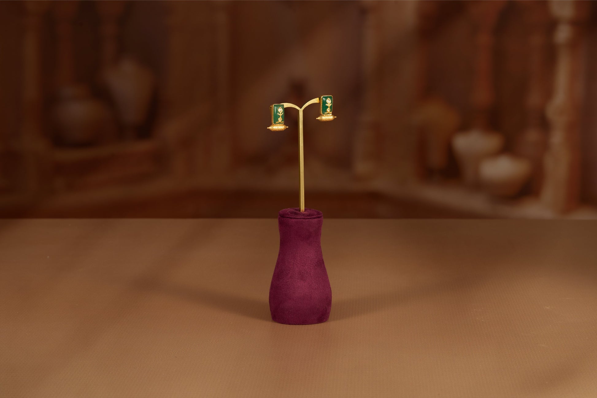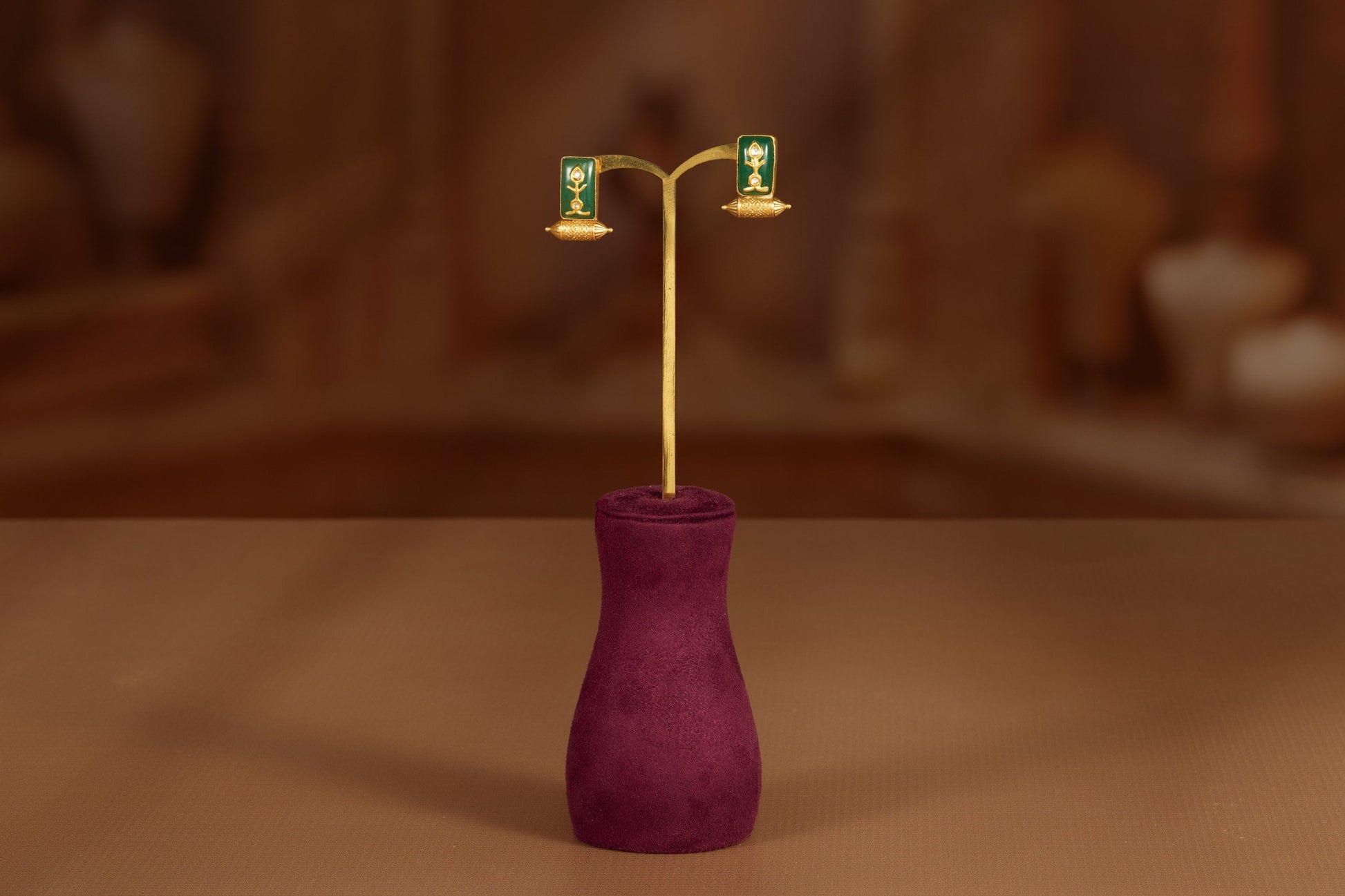 The Earrings feature a unique rectangular green enamel base. The bottom portion resembles a miniature diya, intricately carved with golden detailing that glows with every turn. The fusion of temple-style engravings and rich green enamel work gives it a regal yet soulful appeal.