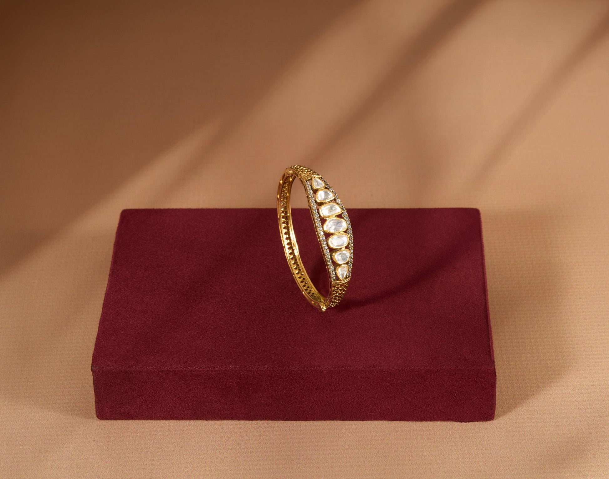 The bangle features a classic, solid band structure. It is defined by its clean central line of sparkling stones and its richly textured sides.The top surface is divided into three distinct lines: A central channel for the detailed diamond like stones. The borders are crafted with intricate micro-textured white stones