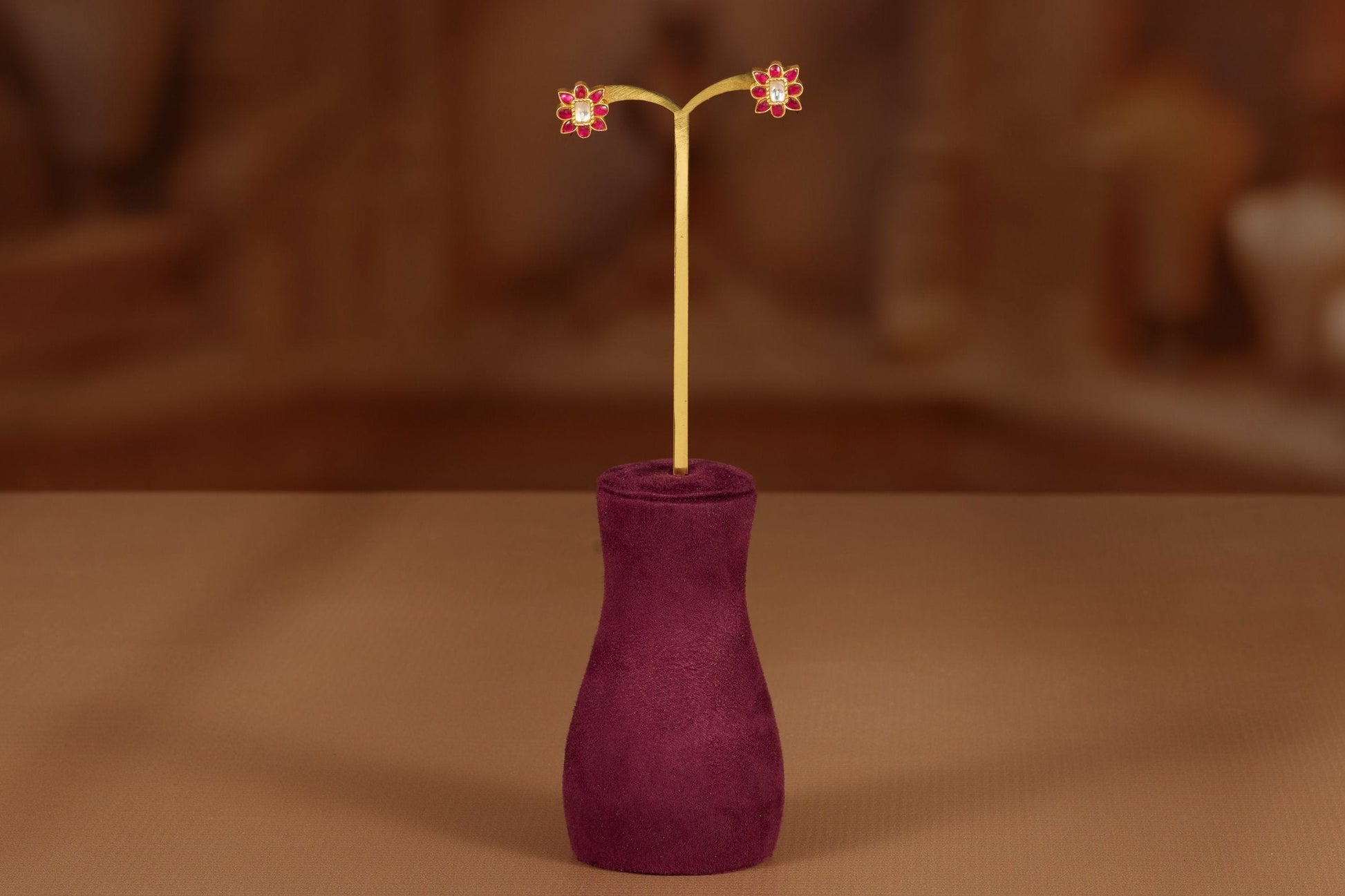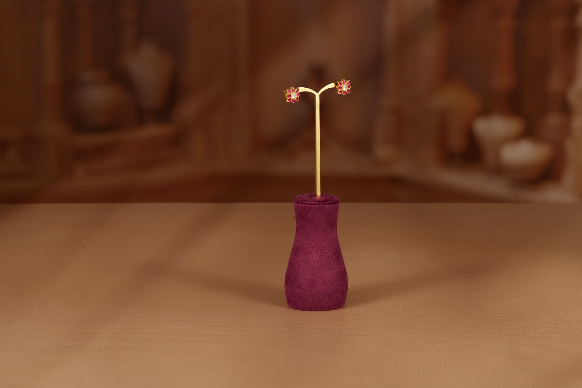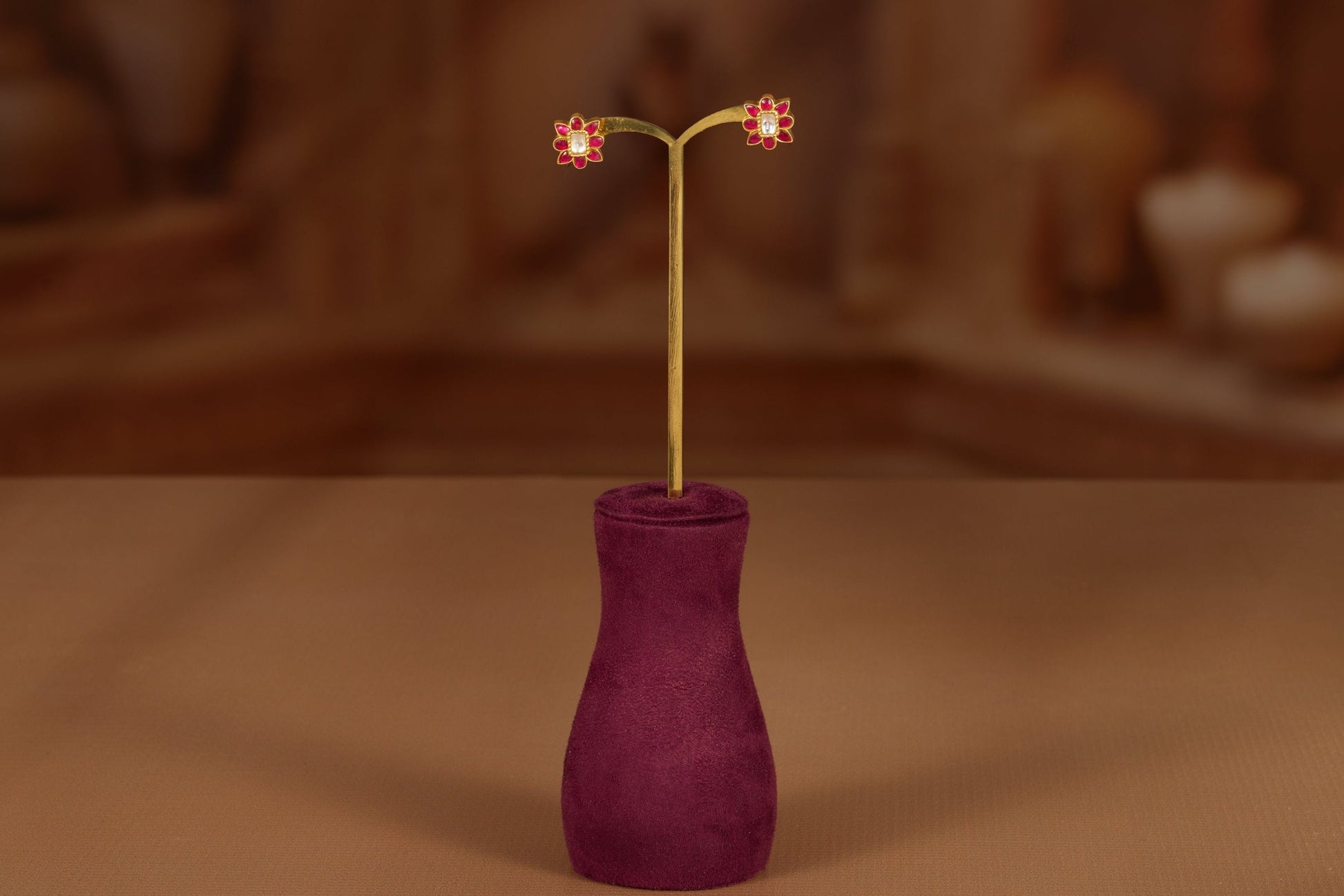 A cluster of vibrant, colorful gemstones, likely pink rubies, which form the central core of the stud. Surrounding this colored center is a brilliant ring of smaller, accent stones (diamond simulants) that resemble the petals of a flower or the rays of a star. This multi-stone setting creates a highly textured and dynamic surface.