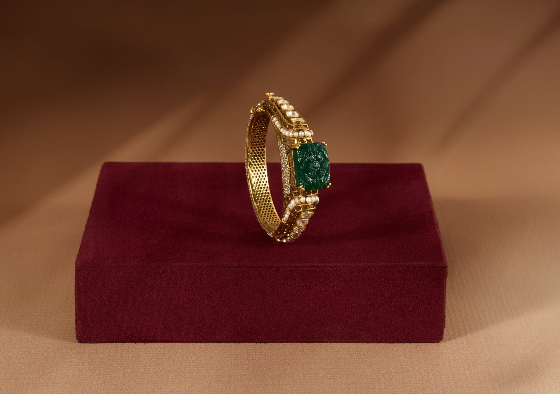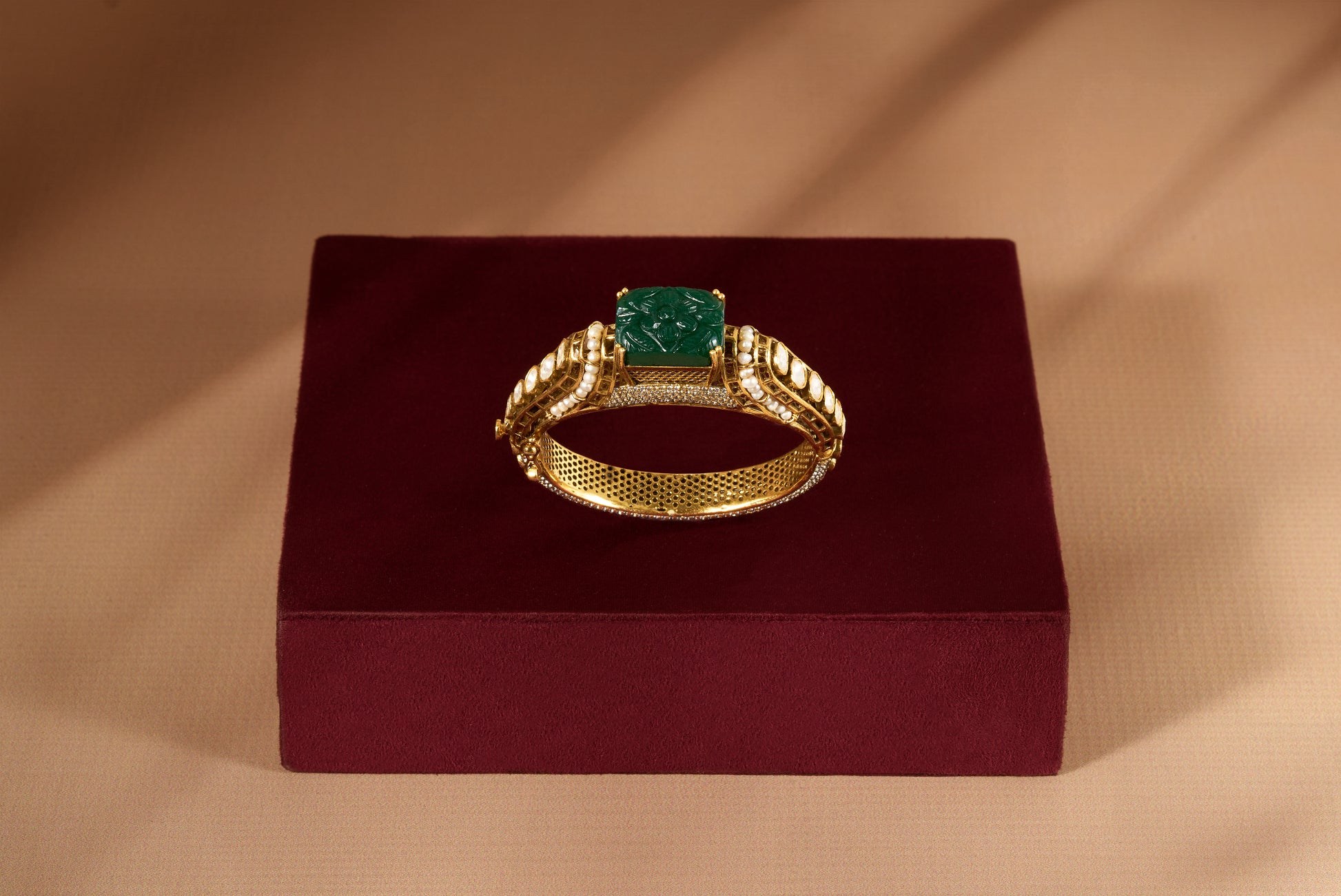 The Kada features a broad, solid gold band. Often utilizing a filigree pattern. The design is entirely focused on the prominent central emerald-like stone, which is likely carved a floral pattern. This large central gem is flanked by borders of smaller, shimmering diamond-like crystals and delicate pearls or white beads. .
