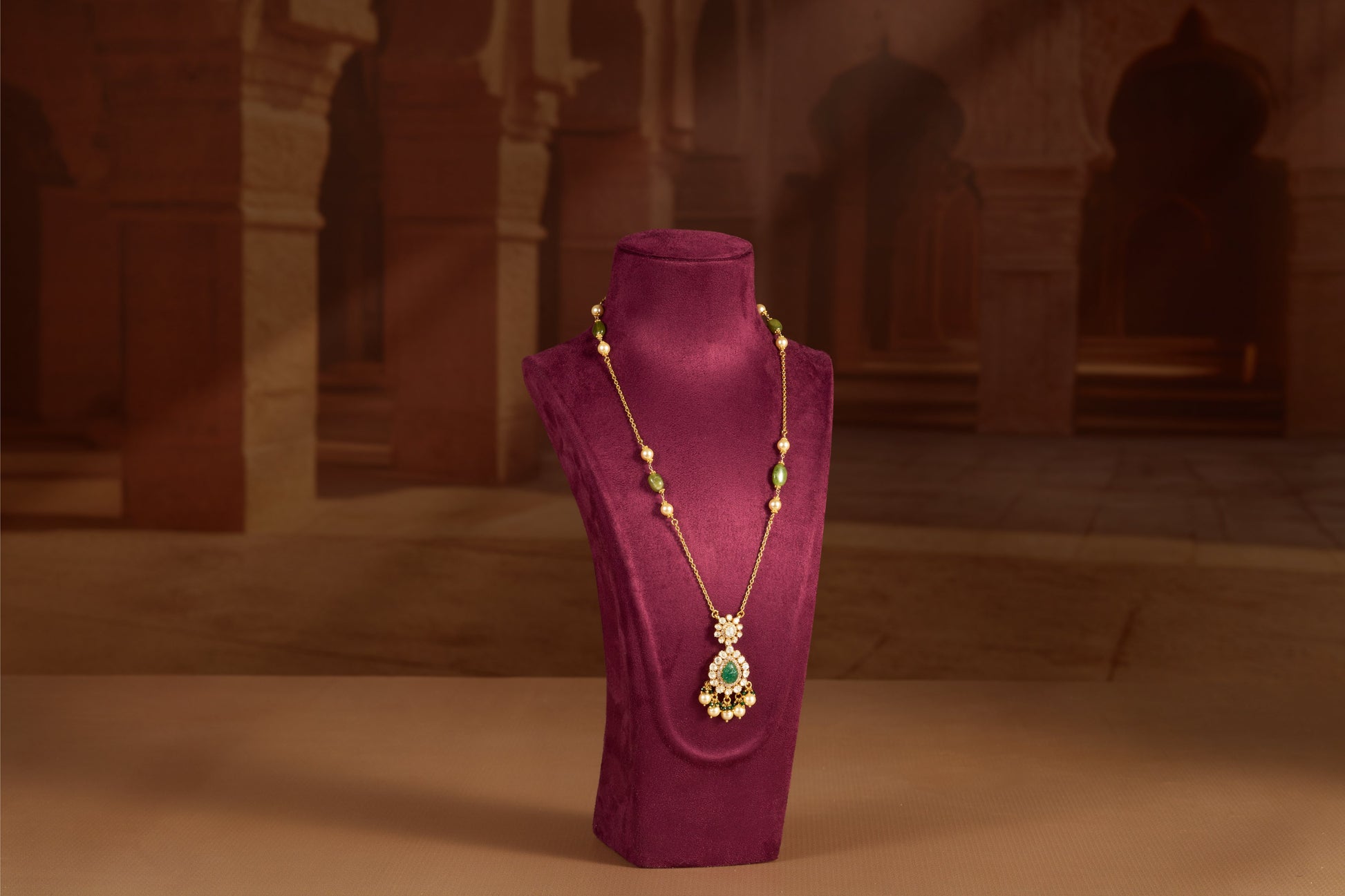 This chain is characterized by a delicate gold chain accented with carefully spaced beads, leading down to a focal pendant. The central pendant is the highlight, featuring a prominent oval or cushion-cut deep green stone. This stone is surrounded by a halo of white Polki stones. The pendant is finished with delicate small pearl drops