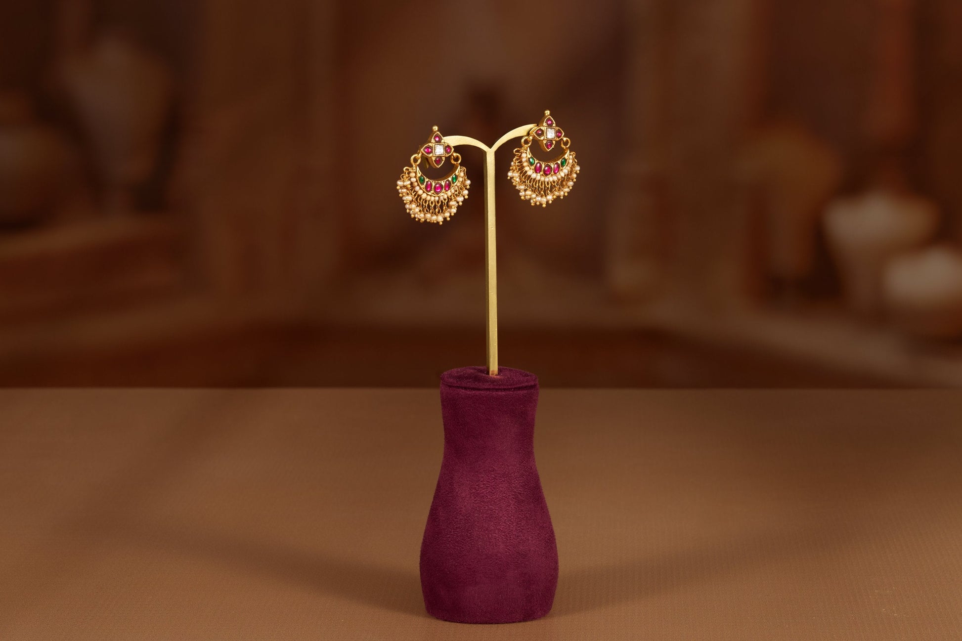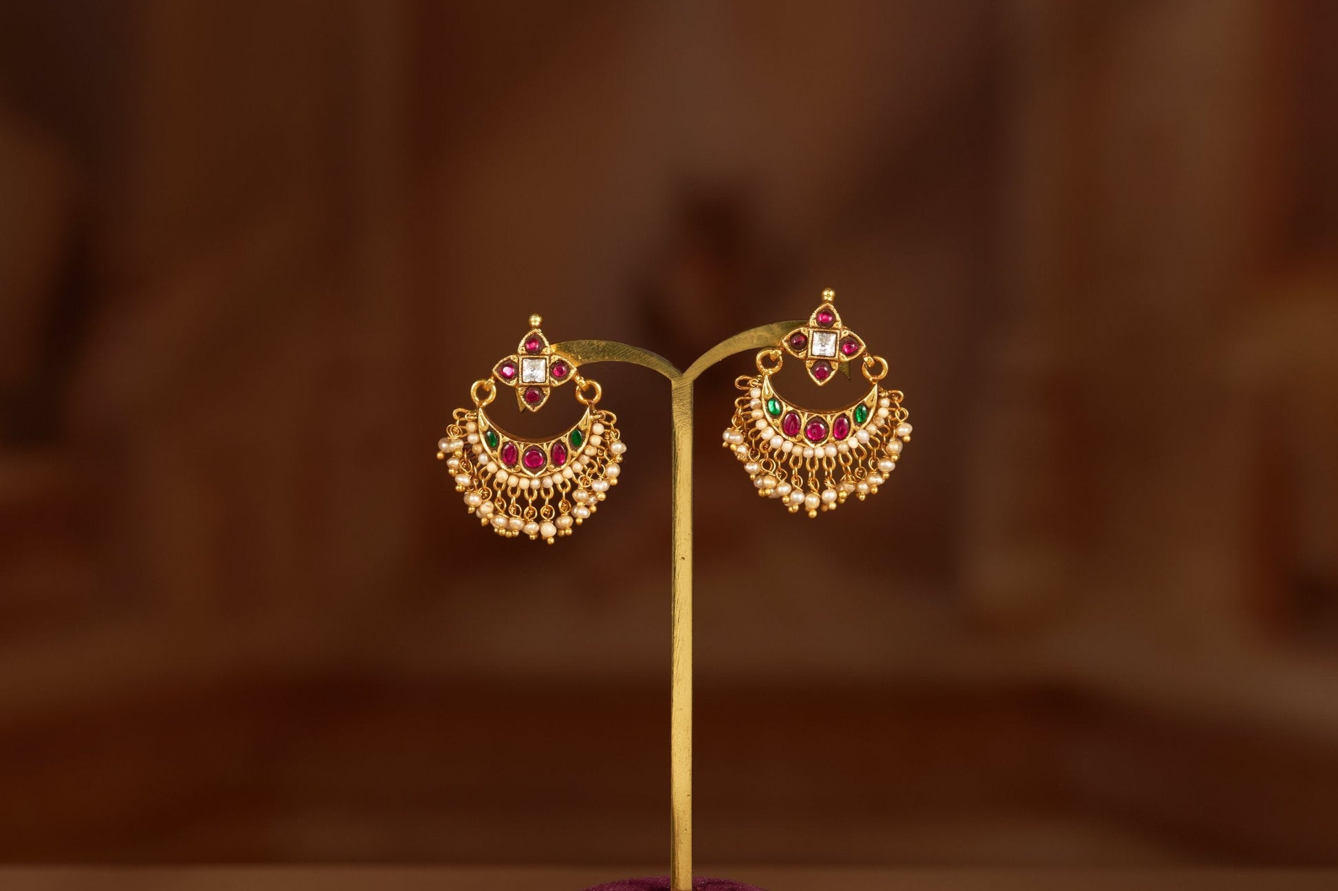 The chandbali-inspired earrings feature a delicate half-moon silhouette adorned with crimson ruby stones and intricate beaded hangings. The bottom fringe of mini gold droplets adds movement and festive sparkle, while the symmetrical layout highlights classic craftsmanship.