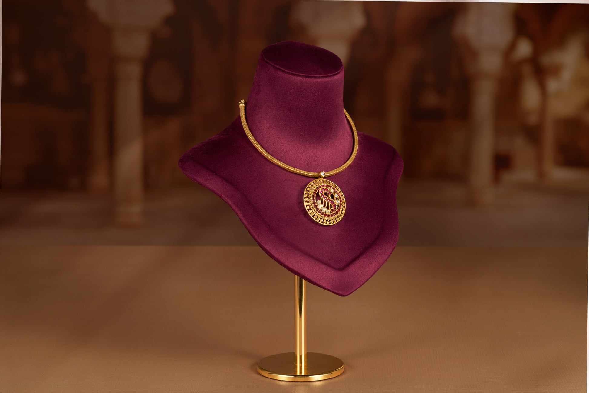 A peacock, intricately set with vibrant ruby-like red and shimmering white semi-precious stones. It sits perfectly at the collarbone, making it an ideal, Discover the finest traditional choker necklaces online and add this magnificent piece to your heirloom collection.