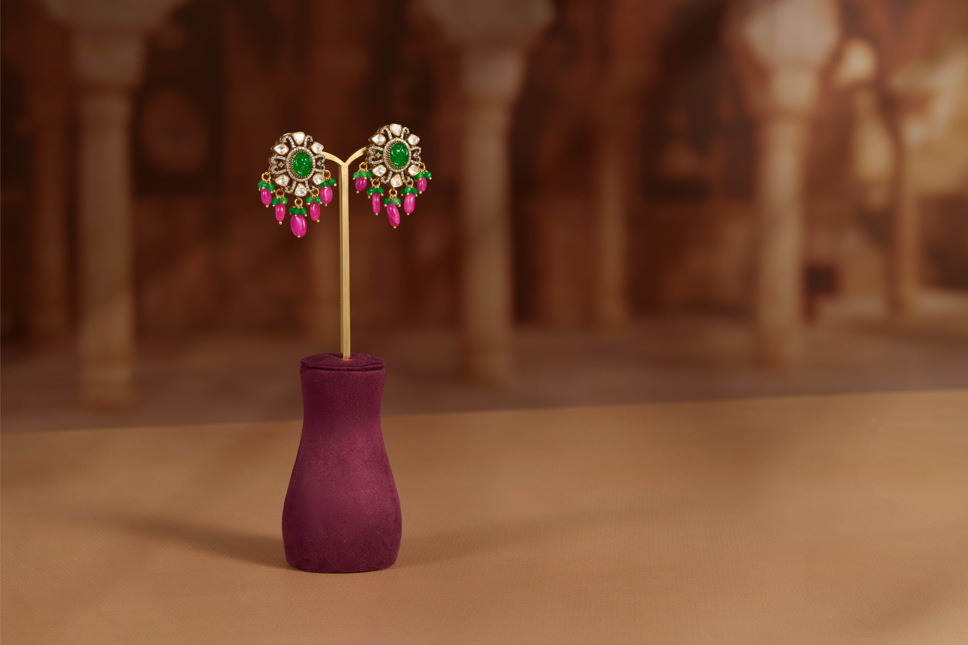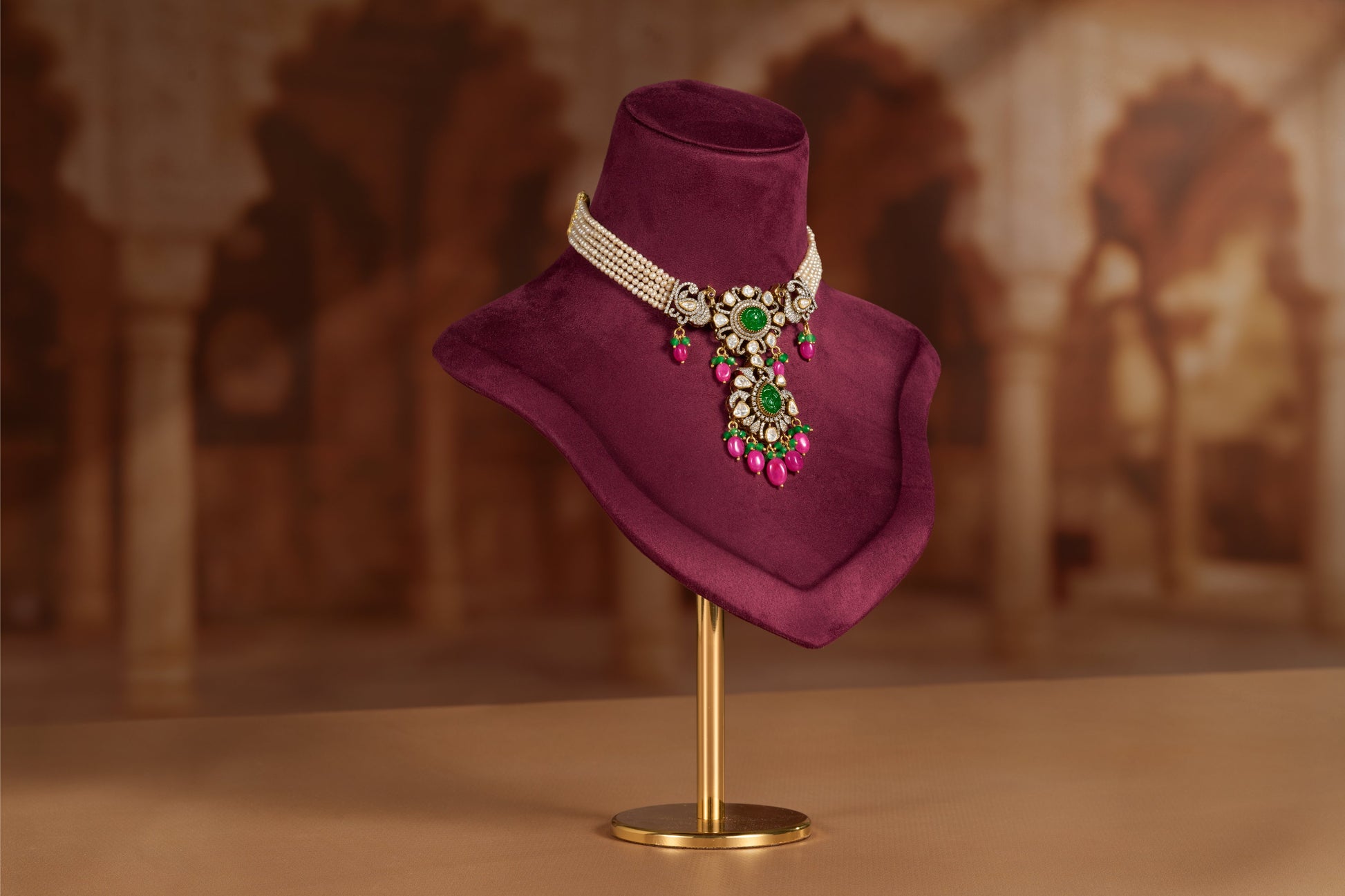 • The choker composed of five to six strands of tightly woven small, lustrous white pearls, creating a luxurious, textural collar. The central motif is fashioned using the Kundan/Polki technique, featuring uncut polki stone surrounded by a halo of smaller stones. The large central emerald-cut green stone, which is framed by smaller Polki and pink/ruby accent stones. The accompanying earrings mirror the design, featuring a central emerald green stone and pink ruby drops.