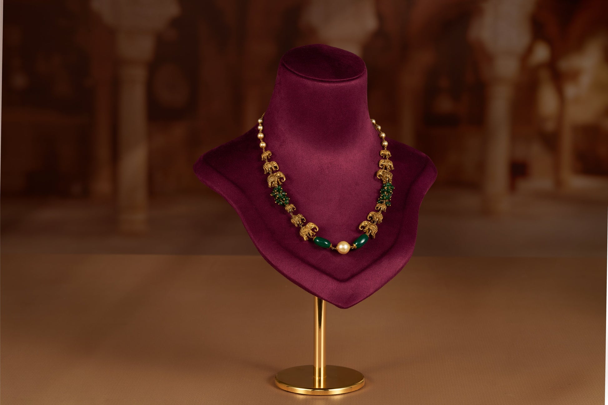 The necklace features a traditional, short collar or princess length design. The main body alternates between highly detailed gold units and clusters of vibrant green stones.