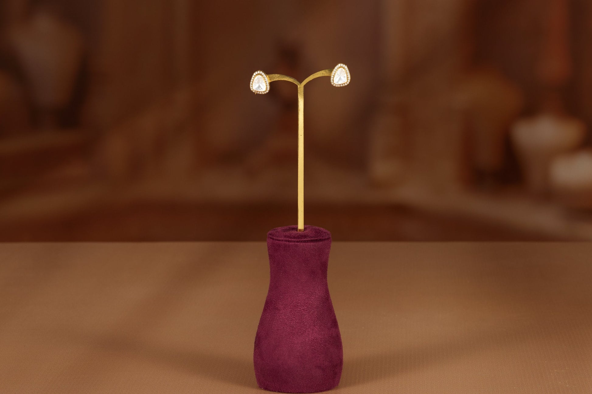 Design: The earrings feature a single, simple teardrop or pear-shaped Polki stone held by a minimal gold bezel. The gold setting is minimal, acting as a protective frame that allows the stone's unique shape and light to dominate.